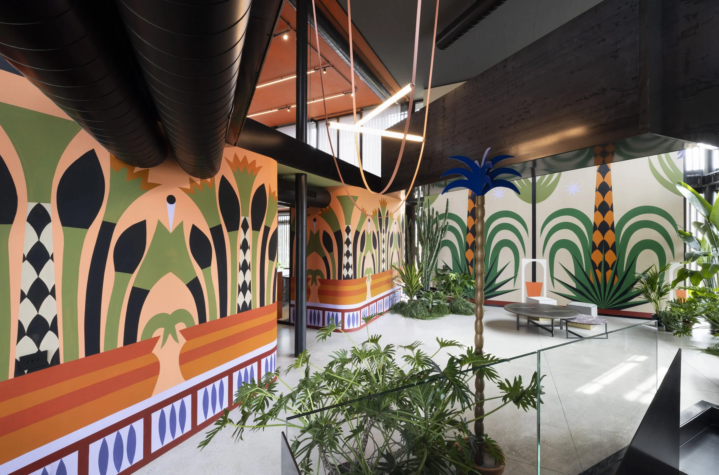 Starting from a four-meter totemic metal sculpture placed on a reflecting pool outside the building, Mirage unfolds as an intervention that spans the entire Ecoedile headquarters in Trescore Balneario, from the entrance to the three interior levels. Painting, sculpture, living plants, and spatial reconfiguration combine to create a total environment in dialogue with Enzo Nembrini's art collection, curated by Rischa Paterlini. The project breaks the neutrality of the architecture, transforming it into a continuous visual landscape — a kind of concrete hallucination where botanical patterns and unexpected chromatic rhythms redefine the experience of space.